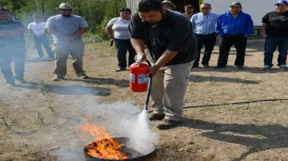 Live fire extinguisher training using the PASS technique (Pull, Aim, Squeeze, Sweep) – with live fire training.